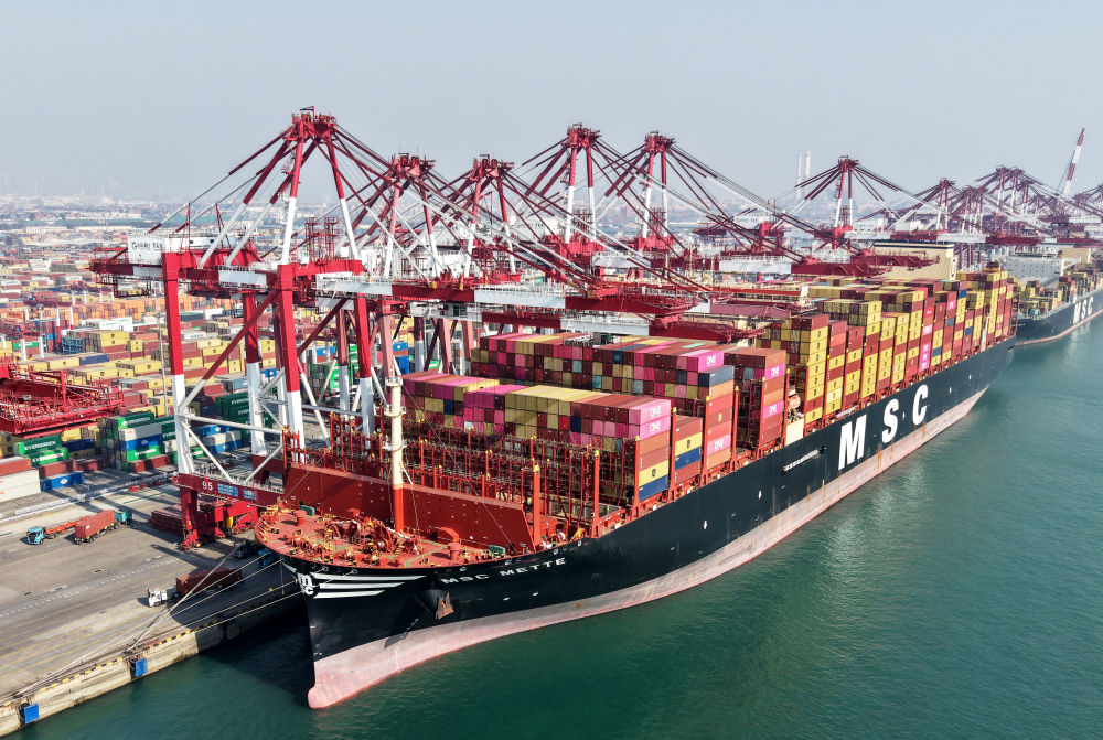 习习海风中,山东港口青岛港全自动化集装箱码头上,岸桥巍然林立,吊臂有序起落。伴随一阵长鸣的汽笛声,经过40小时连续作业,地中海航运“雄心”轮顺利完成1.2万标准箱的装卸任务,满载智能家电、工程机械、汽车配件等国产高附加值产品启程,驶往地中海沿线港口。